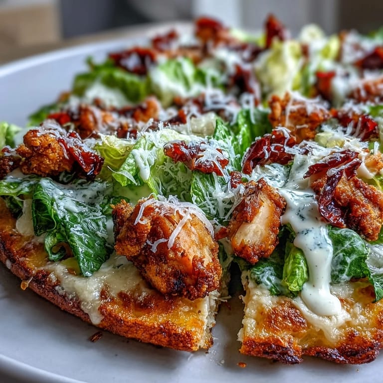 Pin It My sister called mid-afternoon asking what I was making for dinner, and I realized I'd been craving pizza but couldn't face the carb-heavy guilt that usually follows. Standing in front of my fridge, I spotted chicken breasts and a bag of romaine, and suddenly it clicked: what if the crust itself was the protein? Twenty minutes later, I was sliding a golden chicken crust onto a cutting board, topping it with fresh Caesar salad, and she showed up just in time to see it come together. This dish stopped being an experiment the moment we took that first bite.