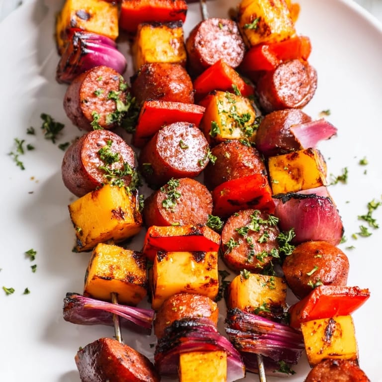Pin It A hearty and flavorful appetizer featuring smoky sausage rounds and melty cheese cubes stacked and grilled on skewers, perfect for sharing at gatherings.