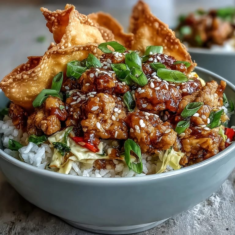 Timing is everything here, so assemble your bowls right before eating. The rice should be warm, the chicken mixture should still be hot, and the wonton strips should be at their crispiest possible moment. If you're cooking for a crowd, you can have all the components ready and let people build their own bowls, which turns dinner into something more interactive and fun.