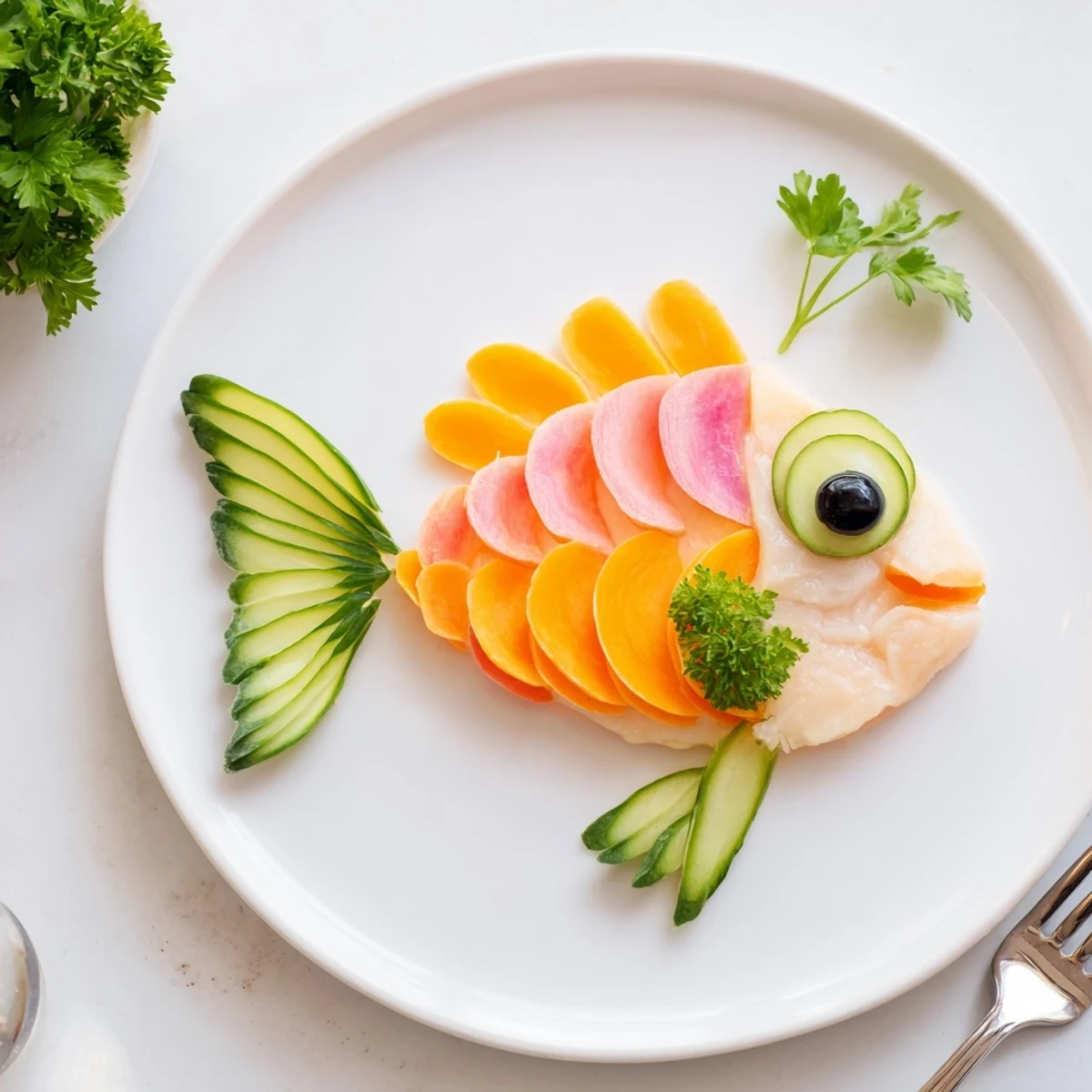Pin It A playful, healthy dish designed in the shape of a fish, featuring fresh vegetables and tender white fish fillet. Perfect for a light lunch or an elegant starter.