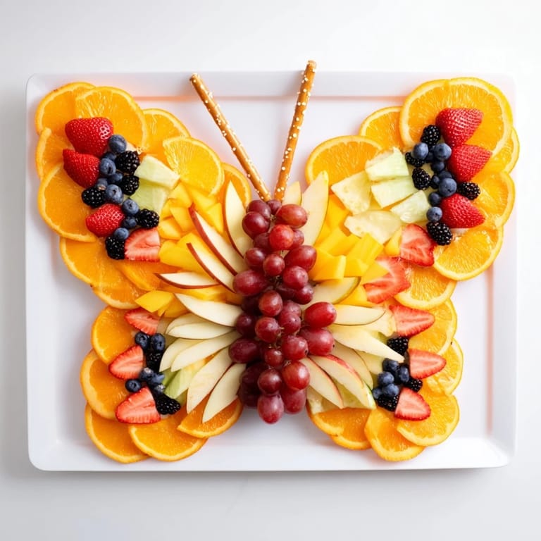 Pin It A vibrant and whimsical fruit tray arranged in the shape of a beautiful monarch butterfly, perfect for parties, kids events, or a healthy summer treat.