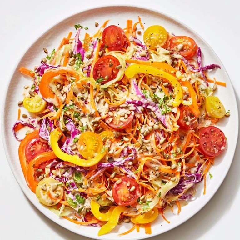 Pin It There's something magical about assembling a salad where every color tells its own story. I was juggling groceries one Tuesday evening when I spotted bell peppers in red, yellow, and orange all at once, and suddenly the idea of building something that looked like a painter's palette took hold. My kitchen transformed into this bright, chaotic space filled with the smell of fresh vegetables and the sound of the knife hitting the board in that satisfying rhythm that makes cooking feel almost meditative.
