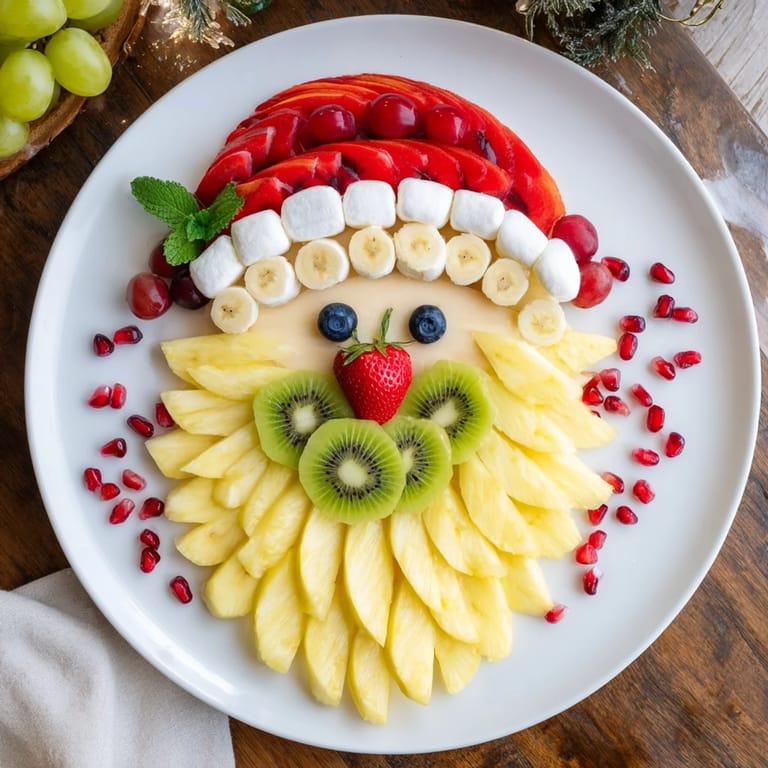 Pin It A festive and eye-catching fruit platter designed to resemble Santa Claus, featuring a juicy pineapple beard and a colorful array of fresh fruits—perfect for holiday gatherings.
