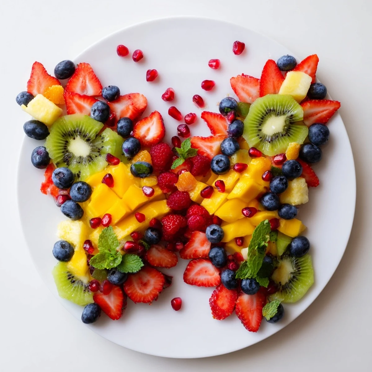 - On a large serving platter, shape the mixed fruit into a butterfly: create two larger mounds for wings and a smaller line of fruit for the body.